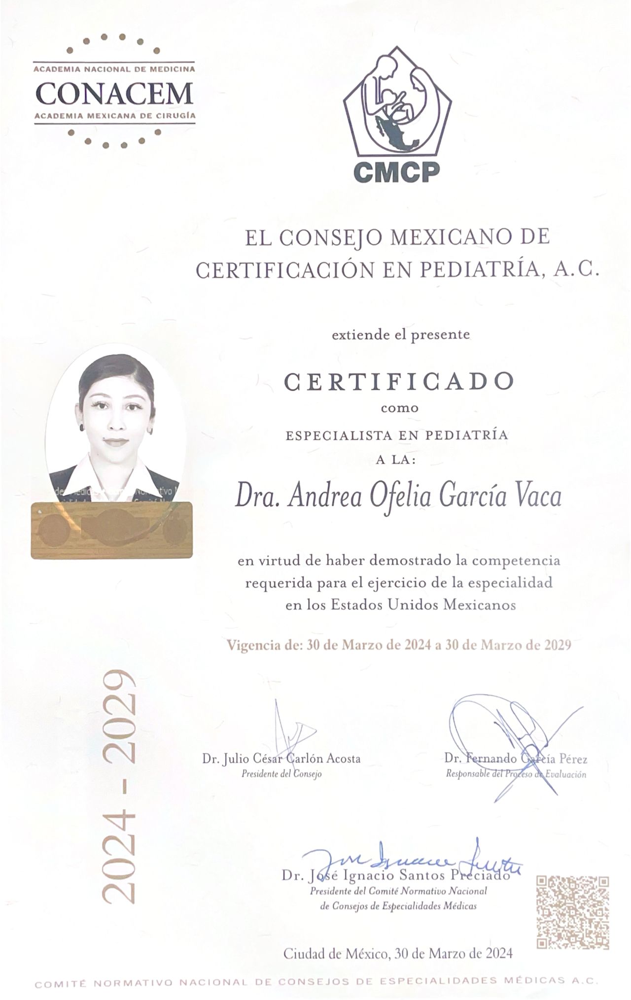 Certificada por el Consejo Mexicano de Certificación en Pediatría.